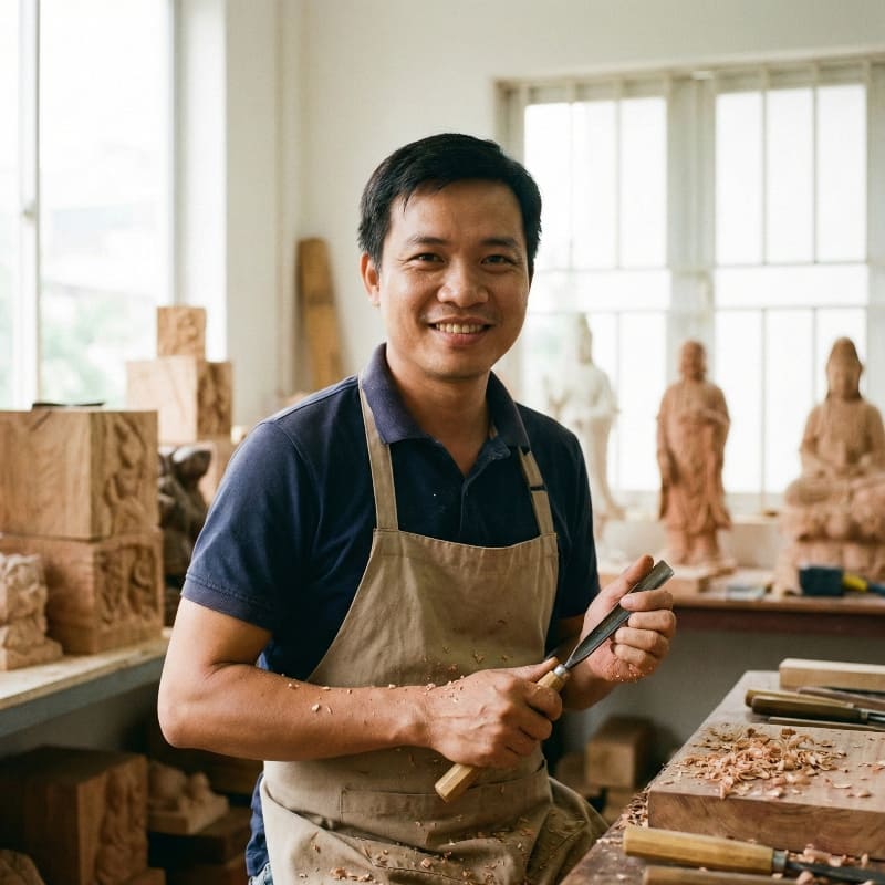 Xưởng sản xuất tại 70 Bùi Thị Xuân, Phường Phạm Ngũ Lão, Quận 1 được trang bị đầy đủ thiết bị CNC hiện đại kết hợp với đội ngũ thợ khắc tay nghề cao. Quy trình sản xuất được kiểm soát chặt chẽ với 12 công đoạn kiểm tra chất lượng, đảm bảo mỗi sản phẩm đều đạt tiêu chuẩn xuất xưởng 99.8%.